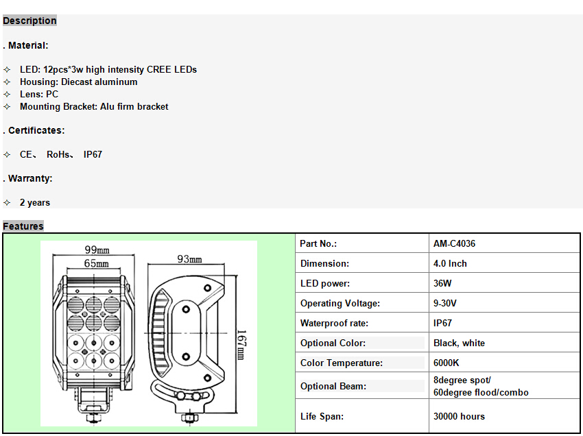 AM-C4036 9-30V DC 36W 4.0 INCH CREE LED LIGHT BAR