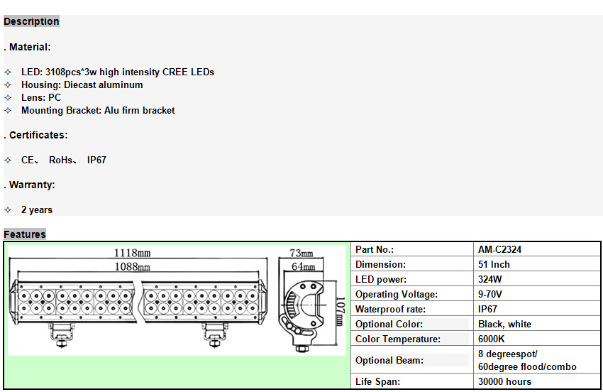 AM-C2324 9-70V DC 324W 51 INCH CREE LED LIGHT BAR